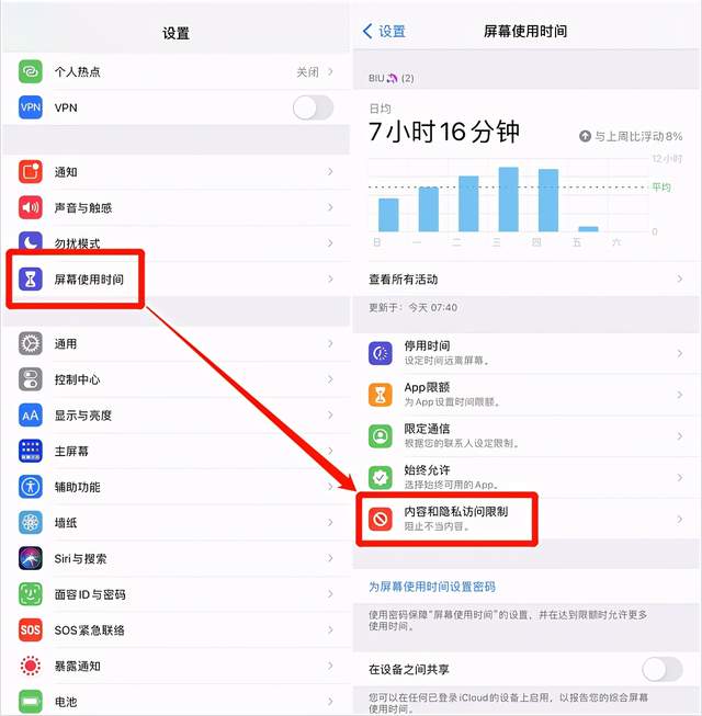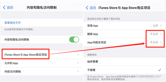 打开设置里面的【屏幕使用时间】-【内容和隐私访问限制】-【App Store购买项目】,按照下图进行设置。