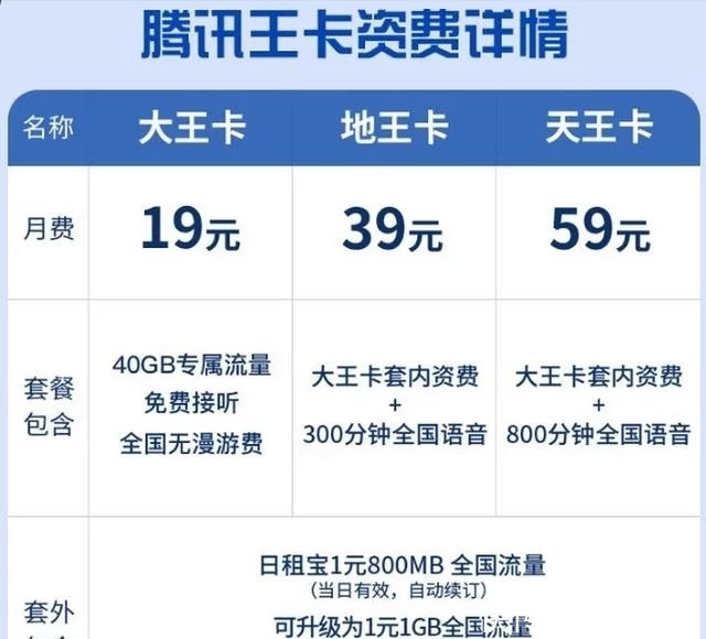 腾讯王卡分别三种类型,分别是每个月19元的腾讯大王卡和每个月39元的腾讯地王卡,每个月59元的腾讯天王卡套餐。这款套餐看起来也是非常的实惠,因为我们现在手机里面所安装的软件,腾讯系的软件是非常多的,这些软件都是可以免流所使用的。